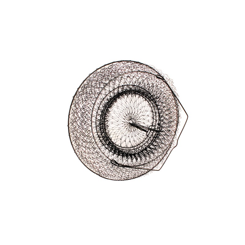 Collapsible wire basket features springloaded trap doors both on top and bottom for easy loading and unloading. Constructed of 5/8" anodized wire mesh with bottom reinforced ring and sturdy wire handles.