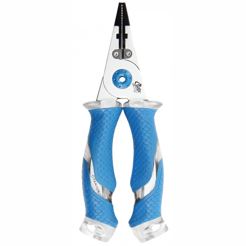 These 7.5" Cuda pliers feature Tungsten Carbide Mono and Braid cutting blades and Titanium Bonded jaws. With Aluminum Alloy construction and non-slip Cuda pattern handle grips. The durable full tang construction is visible through the handle design. A ballistic nylon sheath for storage and a convenient lanyard are both included.