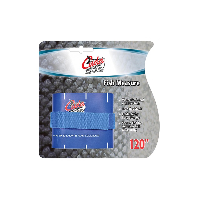 Measure the size of your catch with Cuda 120" Fish Measure. This Fish Measure is water-resistant and has tear-resistant. Waterproof nylon construction ensures reliable performance. Foldable for easy storage. Secure end for accurate fish measuring. Large, easy-to-read numbers. Velcro strap allows for quick roll-up.