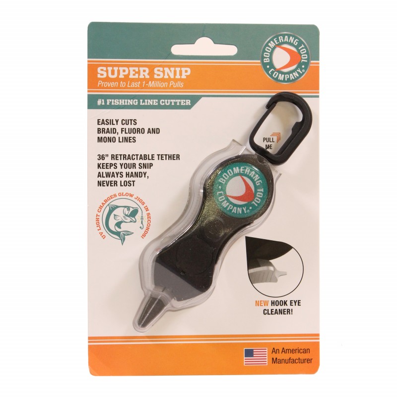 The most innovative SNIP yet, the Super SNIP, features a UV LED Light, Integrated Fish Hook Eye Cleaner, Retractable carabiner reel and 400 series stainless steel long blades. The UV LED conveniently charges glow jigs in seconds and provides the perfect amount of light to work with your SNIP in low light conditions. The stainless steel corrosion resistant cutters with long blades cuts braid, fluoro and mono lines clean and smooth every time.