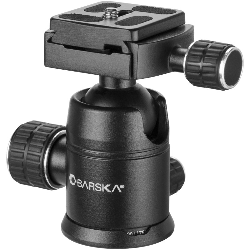 The Barska Ball Joint Tripod Head is a lightweight ball head that is strong enough to support SLR or DSLR cameras with a medium lens, and lighter medium format cameras. This Compact Ball Head Mount features one main knob that unlocks the ball joint so that you can quickly position your camera properly, retighten the knob, and return to shooting. There is also a full 360 degree panning knob that allows the camera to be rotated on a full 360 degree axis without having to loosen the ball joint. The Ball Joint Tripod Head by Barska features a 90 degree notch which facilitates shooting in portrait orientation, and one bull's eye bubble leveler to make sure the tripod is perfectly level. The included quick-release plate has a retractable video pin, and attaches to your camera via its standard 1/4"-20 screw. With your camera attached to the quick-release plate, it easily snaps and locks into place on the ball head, and a tightining safety knob prevents it from being accidentally released. Tripod and camera not included.