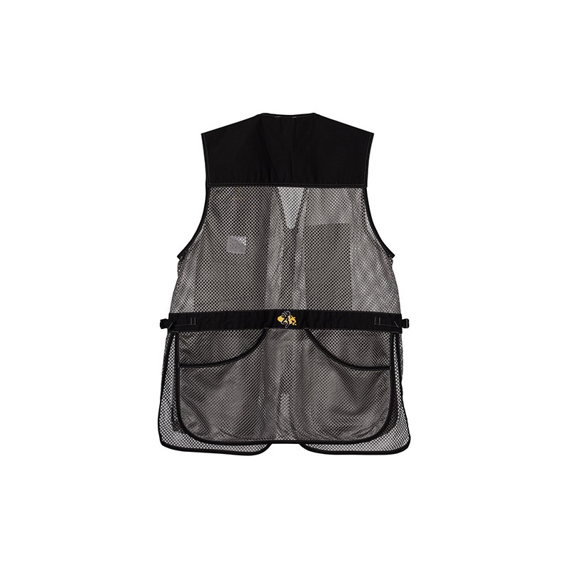 Left-hand design, lightweight breathable mesh shooting vest with a full-length shooting patch, bellows pockets for shells/gear, and a large back pocket for hulls and other gear.