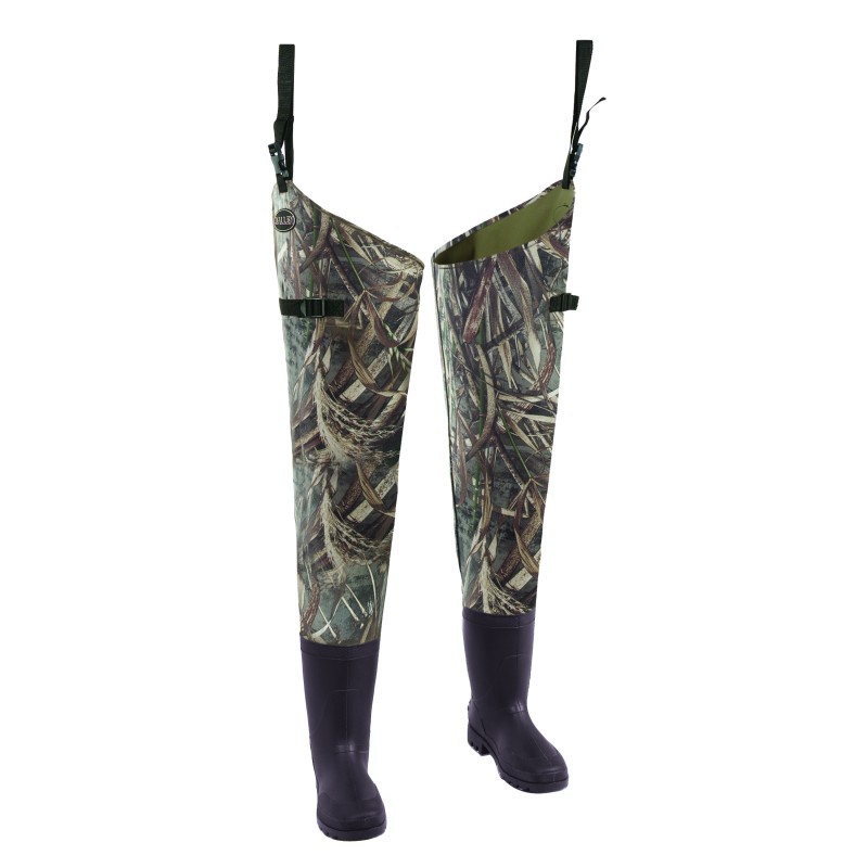 The Dillon Camo 2-Ply Hip Waders with cleated soles feature rugged polyester fabric construction with a two-ply upper and an adjustable belt strap.
