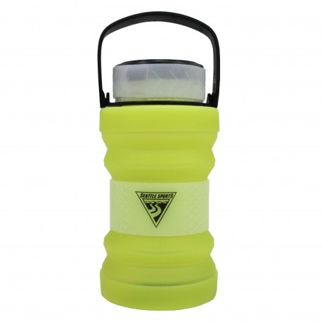 Improving the drinkability and versatility of collapsible bottles, the Firewater Plus combines a waterproof, USB/Solar chargeable LED lantern lid (FireLid) with a 750 mL collapsible bottle. USB cord included. Detachable handle. A glow-in-the-dark, sturdy silicone center band makes it easy to find your bottle in the dark and increases confidence and drinkability when holding the flexible bottle. Choose from either a green or white bottle.