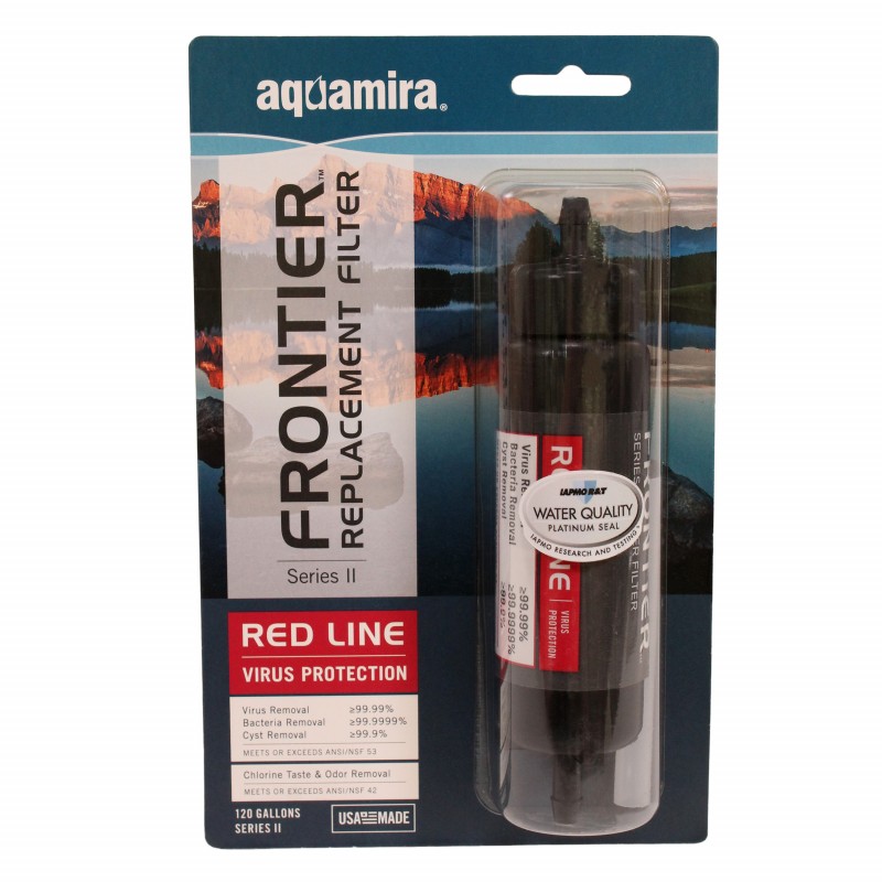 The next time you leave the house, don't just pack any water bottle. Instead grab the Frontier Filtered Water Bottle by Aquamira. The Series II Green Line replaceable filter removes greater than 99.9999% of bacteria, Cryptosporidium, Giardia, chlorine, bad tastes and odors. When heading abroad or to areas prone to viruses, our Series II Red Line replaceable filter offers added virus protection.